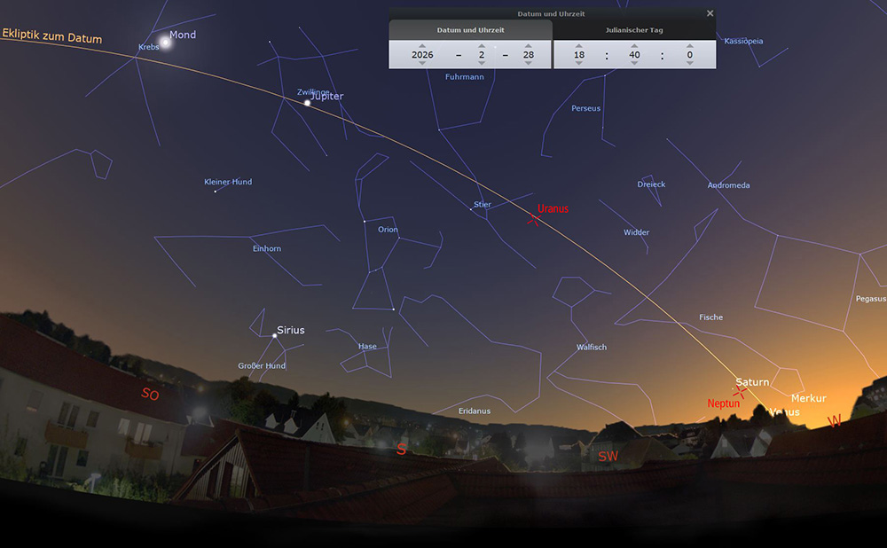Die obere Abbildung zeigt den simuliertern sichtbaren Himmelsausschnitt am Samstagabend um 18:40 Uhr.